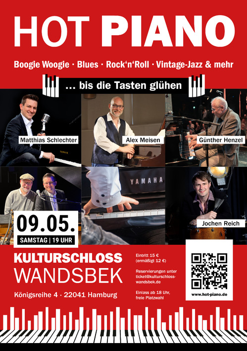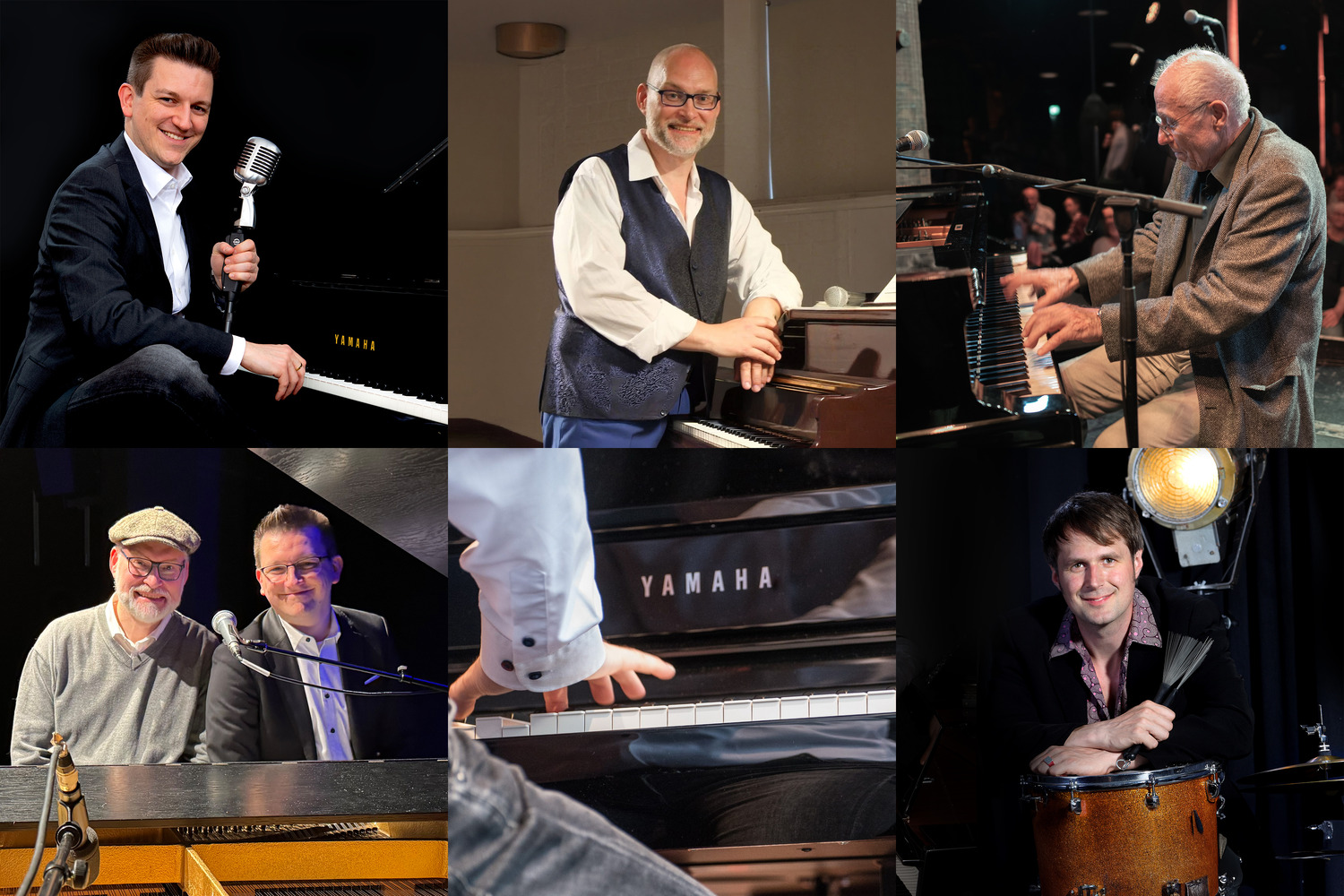 Das Mini-Piano-Festival im Kulturschloss Wandsbek: 3 Pianisten und 1 Schlagzeuger laden zu einer energiegeladenen Reise durch die goldene Ära der heißen Pianomusik ein.